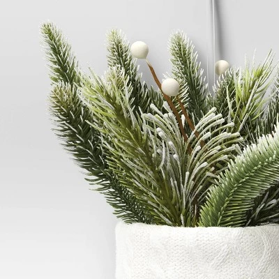 Complete your wintertime decorations with this 15-Inch Hanging Knit Mitten with Flocked Greenery and Berries Artificial Plant from Wondershopâ„¢. This Christmas hanging features a faux foliage of flocked cypress branches and white berries that’s potted inside a white knitted mitten for a snowy and cozy look. This decorative artificial plant comes with an attached loop for easy hanging on a wall or door hook anywhere in your indoor space.