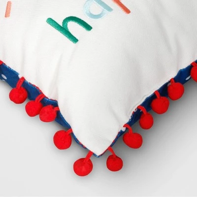 Beautifully accent your couch or armchair for the holidays with the Reversible “Ho Ho Ho Happy Holidays” to Polka Dot Rectangle Lumbar Pillow. This reversible lumbar throw pillow features the message “Ho Ho Ho Happy Holidays” in multicolor on the white backdrop on one side and a white polka-dot pattern on a blue backdrop on the other for timeless style. It also comes covered with red pom poms along the four sides for a decorative look. Made with soft fabric, this throw pillow is great for both sheltered outdoor and indoor use.