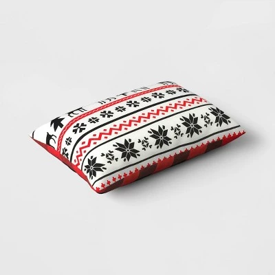 Add merry vibes and holiday fun to your home decor with the Reversible Buffalo Plaid “Merry” to Fair Isle Snowflake Rectangle Lumbar Pillow from Wondershop™. This red and black lumbar pillow features the text “Merry” on the buffalo plaid backdrop on one side and a Fair Isle pattern on the other side for a festive look. Made with soft fabric, this reversible lumbar pillow makes a beautiful accent piece on your sofa, couch or any other spot.
