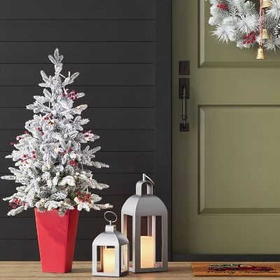 Get the look and feel of a real Christmas tree without the need for care or cleanup with the 4-Foot Pre-lit Flocked Balsam Fir Potted Artificial Mini Christmas Tree with Red Berries and Clear Lights from Wondershopâ„¢. Standing 4 feet tall, this faux Balsam fir tree features a flocked design and is strung with faux red berries and clear incandescent lights that give off a soft, warm glow. Intended for indoor and sheltered outdoor use, the tree rests in a red square pot that helps keep it steady, and it features a flame-resistant construction so you don’t need to worry about placement near a fireplace or decorative candles.
