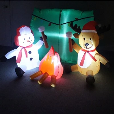 - SELF-INFLATES QUICKLY: Easy to set up; Simply plug in, stake down, and watch as the snowman and reindeer sitting around a campfire roasting marshmallows self-inflates within seconds