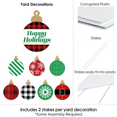 Holiday or Christmas Lawn Decorations INCLUDES 8 coordinating Black, Red and Green Ornaments yard decorations: 1 Large Sign; 9 Ornament shapes and 16 stakes for displaying. Easy assembly instructions are also included. PERFECT FOR ANY LOCATION! Black, Red and Green Ornaments Yard Signs SIZE large Sign 16.75″ x 23″; Black, Red and Green Ornaments 8.75″ x 11.25″. Happy Holidays yard decor is an easy way to decorate your home for Holiday or Christmas. Both adults and kids will love these ornament party supplies. EASY TO USE: Black, Red and Green Ornaments – Yard Sign & Outdoor Lawn Decorations are professionally printed and cut, making assembly quick and easy. Simply insert two heavy-duty stakes into each Christmas yard ornament and press into the ground to display. HIGH-QUALITY YARD DECORATIONS: Black, Red and Green Ornaments Yard Signs are professionally printed on durable, corrugated plastic. 8-Piece yard decorations are waterproof and can be used outdoors. Christmas lawn decor can be displayed in wind, snow and rain without any worry. MADE IN THE USA: Black, Red and Green Ornaments – Yard Sign & Outdoor Lawn Decorations are designed and manufactured at our Wisconsin facility using materials that are Made in the USA. Black, Red and Green Ornaments Signs use a No-Mess Glitter Print: Our yard decorations are designed with a printed image of glitter, eliminating glitter flake while maximizing bling effect!