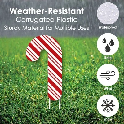 Outdoor Christmas Lawn Decorations INCLUDES 10 coordinating Candy Cane yard decorations: 10 Candy Cane shapes; and 20 sturdy stakes for displaying. PERFECT FOR ANY LOCATION! Candy Cane Yard Signs SIZE 8.5 inches x 15 inches. Vibrant red and white Candy Cane yard decor is an easy way to decorate for Christmas or a Holiday party. Both adults and kids will love these Christmas party supplies. Display in front yards of your home, office or party venue. EASY TO USE: Candy Cane Outdoor Lawn Decorations are professionally printed and cut, making assembly quick and easy. Simply insert two heavy-duty stakes into each Christmas yard ornament and press into the ground to display. HIGH-QUALITY YARD DECORATIONS: Candy Cane Yard Signs are professionally printed on durable, corrugated plastic. 10-Piece yard decorations are waterproof and can be used outdoors. Christmas lawn decor can be displayed in wind, snow and rain without any worry. MADE IN THE USA: Candy Cane Lawn Decorations – Outdoor Holiday and Christmas Yard Decorations are designed and manufactured at our Wisconsin facility using materials that are Made in the USA.
