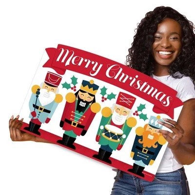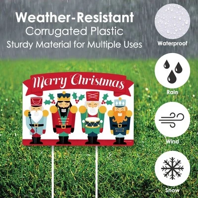 Christmas Nutcracker Party Yardy Sign INCLUDES 1 weather resistant plastic sign and 2 sturdy stakes for displaying. Create goose bump moments, those memories to last a lifetime, when you display Merry Christmas yard sign with stakes. OUTDOOR LAWN DECOR: This Holiday yard sign lawn decoration MEASURES 23 inches wide x 15.25 inches tall. The perfect size to stake into the ground, creating an eye-catching display at your home, business, or party venue. If displayed outdoors, yard sign rules and regulations vary from city and state, we recommend checking your local guidelines. EASY TO USE YARD SIGN: Christmas Nutcracker outdoor yard sign is professionally printed and cut, making assembly quick and easy. Simply insert two heavy-duty stakes into Christmas Nutcracker yard ornament and press firmly into the ground to display. Easy assembly instructions are included. HIGH-QUALITY YARD DECORATION: Christmas Nutcracker yard sign decoration is professionally printed on durable, corrugated plastic. Holiday party Yard Sign Lawn Decoration is waterproof and can be used outdoors – displayed in wind, snow, and rain without any worry. MADE IN THE USA: Christmas Nutcracker yard sign is designed and manufactured at our Wisconsin facility using materials that are Made in the USA. If displayed outdoors, yard sign rules and regulations vary from city and state, we recommend checking your local guidelines.