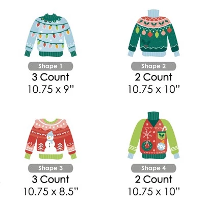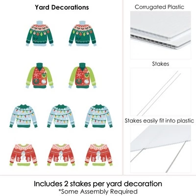 Big Dot of Happiness Outdoor Jingle-bell sweaters Lawn Decorations INCLUDE: 10 coordinating Colorful Christmas Sweaters yard decorations: 10 ugly sweaters Shapes and 20 sturdy stakes for displaying. PERFECT FOR ANY LOCATION! Colorful Christmas Sweaters Yard Signs SIZE: Sweater Shape 1 (10.75” x 9”), Sweater Shape 2 (10.75” x 10”), Sweater Shape 3 (10.75” x 8.5”) and Sweater Shape 4 (10.75” x 10”). Vibrant Jingle-bell sweaters yard decor is an easy way to decorate a Ugly Sweater Holiday Christmas Party. Both adults and kids will love these Jingle-bell sweaters party supplies. Display in front yards of your home or party venue. EASY TO USE: Colorful Christmas Sweaters Lawn Decorations are professionally printed and cut, making assembly quick and easy. Simply insert two heavy-duty stakes into each yard ornament and press into the ground to display. HIGH-QUALITY YARD DECORATIONS: Colorful Christmas Sweaters Lawn Yard Signs are professionally printed on durable, corrugated plastic. 10-Piece yard decorations are waterproof and can be used outdoors. Jingle-bell sweaters lawn decor can be displayed in wind, snow, and rain without any worry. MADE IN THE USA: Colorful Christmas Sweaters Lawn Decorations – Outdoor Ugly Sweater Holiday Christmas Party Yard Decorations are designed and manufactured at our Wisconsin facility using materials that are Made in America.