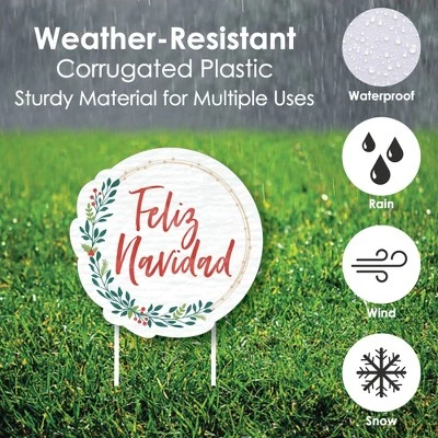 Christmas Lawn Decorations INCLUDES 8 coordinating Feliz Navidad yard decorations: 1 Large Feliz Navidad, 3 Banner, 4 Wreath, and 16 stakes for displaying. Easy assembly instructions are also included. PERFECT FOR ANY LOCATION! Feliz Navidad Yard Signs SIZE Large “Feliz Navidad” Shape 23″ x 16.75″; Banner Shape 10.75 x 9″; Wreath Shape 8.75″ x 8.75″. Rustic yard decor is an easy way to decorate your home or business for holiday or Spanish Christmas party. Both adults and kids will love these Hispanic Holiday party supplies. EASY TO USE: Wreath – Yard Sign & Outdoor Lawn Decorations are professionally printed and cut, making assembly quick and easy. Simply insert two heavy-duty stakes into each wreath yard ornament and press into the ground to display. HIGH-QUALITY YARD DECORATIONS: Rustic Holiday Yard Signs are professionally printed on durable, corrugated plastic. 8-Piece yard decorations are waterproof and can be used outdoors. Rustic lawn decor can be displayed in wind, snow and rain without any worry. MADE IN THE USA: Feliz Navidad – Yard Sign & Outdoor Lawn Decorations are designed and manufactured at our Wisconsin facility using materials that are Made in the USA.