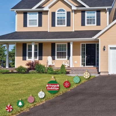 Holiday or Christmas Lawn Decorations INCLUDES 8 coordinating Ornaments yard decorations: 1 Large Sign; 9 Ornament shapes and 16 stakes for displaying. Easy assembly instructions are also included. PERFECT FOR ANY LOCATION! Ornaments Yard Signs SIZE large Sign 16.75″ x 23″; ornaments 8.75″ x 11.25″. Happy Holidays yard decor is an easy way to decorate your home for Holiday or Christmas. Both adults and kids will love these ornament party supplies. EASY TO USE: Ornaments – Yard Sign & Outdoor Lawn Decorations are professionally printed and cut, making assembly quick and easy. Simply insert two heavy-duty stakes into each Christmas yard ornament and press into the ground to display. HIGH-QUALITY YARD DECORATIONS: Ornaments Yard Signs are professionally printed on durable, corrugated plastic. 8-Piece yard decorations are waterproof and can be used outdoors. Christmas lawn decor can be displayed in wind, snow and rain without any worry. MADE IN THE USA: Ornaments – Yard Sign & Outdoor Lawn Decorations are designed and manufactured at our Wisconsin facility using materials that are Made in the USA. Ornaments Signs use a No-Mess Glitter Print: Our yard decorations are designed with a printed image of glitter, eliminating glitter flake while maximizing bling effect!