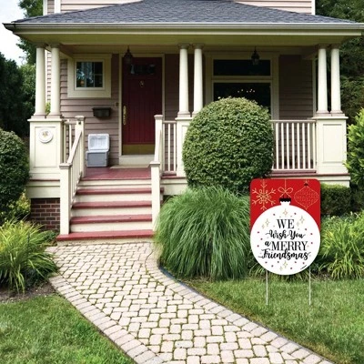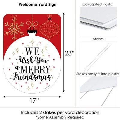 Red and Gold Friendsmas Yard Sign Decoration INCLUDES WE WISH YOU A MERRY FRIENDSMAS corrugated plastic yard sign and 2 sturdy stakes for displaying. PERFECT FOR ANY LOCATION! Red and Gold Friendsmas Yard Sign SIZE 17 inches wide x 23 inches tall. Vibrant red and gold yard decor is an easy way to decorate for Friends Christmas party. Both adults and kids will love these Red and Gold Friendsmas party supplies. Display in front yards of your home or party venue. EASY TO USE: Ornament Lawn Decorations are professionally printed and cut, making assembly quick and easy. Simply insert two heavy-duty stakes into each Friends Christmas party yard ornament and press into the ground to display. HIGH-QUALITY YARD DECORATIONS: Red and Gold Friendsmas Yard Signs are printed on durable, corrugated plastic. Friends Christmas party yard decorations are waterproof and can be used outdoors – displayed in wind, snow and rain without any worry. Friends Christmas party signs also look great indoors at your entrance to greet guests. MADE IN THE USA: Red and Gold Friendsmas – Party Decorations – Welcome Yard Sign is designed and manufactured at our Wisconsin facility using materials that are Made in the USA. Friends yard decorations use a No-Mess Glitter Print: Our yard decorations are designed with a printed image of glitter, eliminating glitter flake while maximizing bling effect!