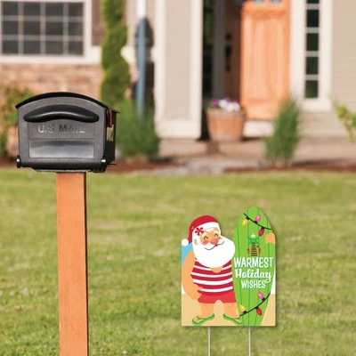 Tropical Christmas Yard Sign INCLUDES: 1 weather resistant plastic sign and 2 sturdy stakes for displaying. Show off to neighbors and pedestrians when you add this eye-catching sign to your property. PERFECT FOR ANY LOCATION! This 1-piece yard sign SIZE 10.75 inches wide x 13.75 inches tall is the ideal height to display in the front yard of your home. If displayed outdoors, yard sign rules and regulations vary from city and state, we recommend checking your local guidelines. EASY TO USE: Beach Santa Lawn Sign is professionally printed and cut, making assembly quick and easy. Simply insert the included two heavy-duty stakes into the sign and press into the ground to display. HIGH-QUALITY YARD DECORATION: Tropical Christmas Yard Sign is professionally printed on durable, corrugated plastic. Christmas in July Party yard sign is waterproof and can be used outdoors – displayed in wind, snow, and rain without any worry. MADE IN THE USA: Beach Santa Yard Sign is designed and manufactured at our Wisconsin facility using materials that are Made in the USA.