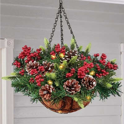 Display this colorful evergreen hanging basket on your covered porch or anywhere inside your home, the basket overflows with pine branches, pinecones and bright red berries accented with sparkling white LED lights. The lights can be set on a 6 hour timer to automatically turn on and off. Req. 3 AA batteries (sold separately). Metal, pinecone, polyfoam and plastic. 12″Dia. x 17″H with hook and chain.