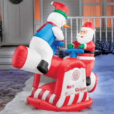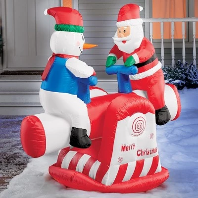Taking a little time for fun, Santa and a friendly snowman take turns going up and down on this inflatable teeter totter. This charming inflatable is a great way to add a delightful touch to your outdoor décor. Simply plug it into an AC outlet, and it automatically inflates, moves up and down and lights up. Includes ropes and stakes to secure it into the ground, plus a 74″L power cord. Polyester and plastic; imported. 48″L x 26″W x 48″H.