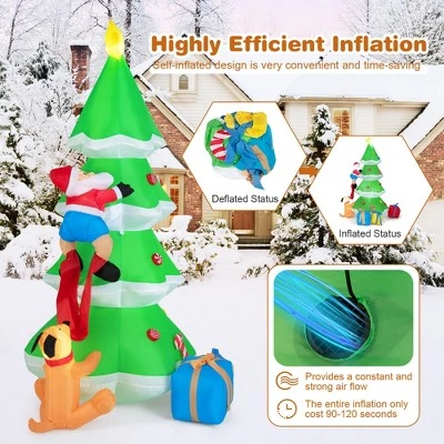 - Interesting Lighted Christmas Decoration: There is a Santa Claus tightly hugging a Xmas tree and a dog fastening its teeth in Santa Claus’s pants. This funny blow-up decoration can delight children, your guests and family. What’s more, the bright LED lights make an appealing nighttime display.