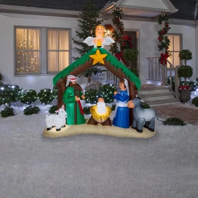 Celebrate the season with an Airblown® Inflatable Nativity Scene! Our Nativity inflatable features the Holy Family, two animal friends, an angel and a big gold star. Setup is super simple. Just plug it in, stake it down and watch the magic unfold. Display this religious Christmas decoration as a standalone or combine it with other Airblown Inflatables to create a custom scene. Includes everything needed for easy outdoor setup.