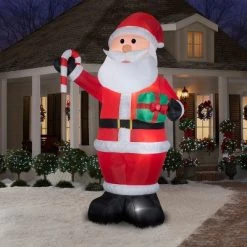Deck the yard with a giant Airblown® Inflatable Santa holding a candy cane and present! Standing 12 feet tall, our giant Santa inflatable makes an eye-catching addition to your outdoor Christmas decorations. Setup is super simple. Just plug it in, stake it down and watch the magic unfold. Includes everything needed for easy outdoor setup.