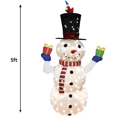 - Our Snowman Yard Light includes a 5 Feet Tall Collapsible Snowman with 160 LED Warm White Lights in Clear Wire and Metal Stakes. Made of Tinsel Material.