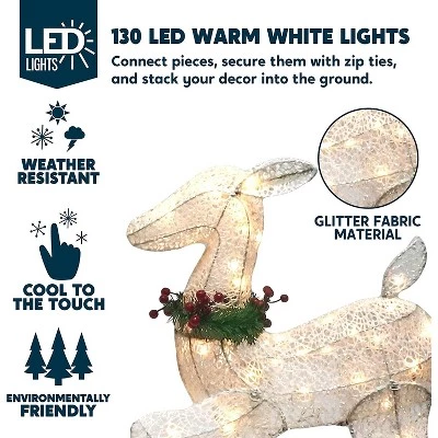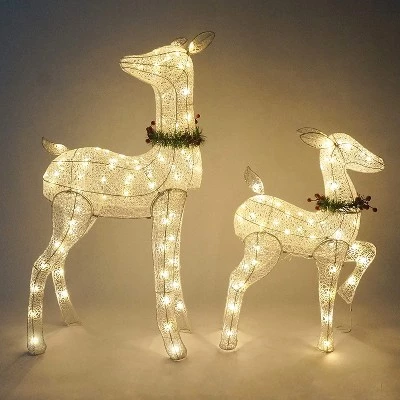 - Our 2 packs of Christmas led yard lights to include 2 reindeer with 130 led warm white lights in clear wire, metal stakes, and zip ties. Made of fabric material. They are 3 ft (fawn), and 4 ft (doe) feet tall.