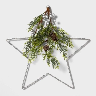 The Lit LED Hanging Star with Greenery in Silver from Wondershop™ is a simple yet stunning decorative piece for the holidays and beyond. This metal star sculpture light is adorned with 40 white LED bulbs that stay lit in a constant glow. It also includes faux pine greenery, pinecones and silver berries for added festive flair. The 14-inch size is perfect for wall and window display and the star is battery operated, so you can easily hang it anywhere you please with the attached metal ring.