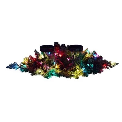 Set your home aglow this holiday season with the help of this artificial candelabrum; specifically designed as an elaborate candle holder, it’s intricately designed from a rich overgrowth of realistic looking pine greenery, handsomely accented with miniature faux pinecones, all carefully surrounding a duo of candle holders. Better yet, this seasonal centerpiece comes already pre-strung with 35 multicolored lights and a light frosting of fake snow, eliminating unsightly messes and holiday stress. Reaching 24” long, this winter-ready decorative accent would make a snowy addition to a mantle or a holiday-inspired tablescape. Silk arrangements are manufactured using synthetic materials, such as polyester material or plastic, and are well designed and constructed to be life-like in appearance. This item will need to be re-shaped when removed from the secure box to allow it to reach its fullest size. Your artificial arrangement will look beautiful for years to come; simply wipe clean with a soft dry cloth when needed.