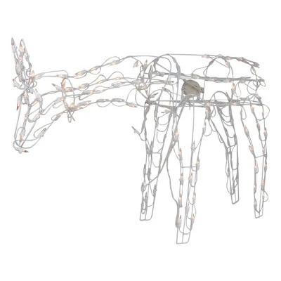 Create a beautiful winter scene in your yard with this beautiful feeding doe lighted lawn decoration. She comes pre-lit with 150 clear incandescent mini lights, and her animated head gently moves up and down. Passersby will bask in the warm glow of the lights as she stands quietly on your lawn.Product Features:Feeding doe wire frame sculptureHead moves up and down with attached motorColor: clear bulbs / white wireBulb size: miniBulb type: incandescent Bulb count: 15030″ white lead cordWire gauge: 22Additional Product Features:Easy assembly, no tools requiredGround stakes includedWeather resistant, powder-coating wire frameContains 1 plug with end connector, allowing you to stack multiple lighted decorations together (not to exceed 210 watts)If one bulb burns out, the rest will stay litComes with replacement bulbs and spare fusesCollapsible construction for easy storageUL certified and approved for indoor/outdoor use120 volts, 60 hertzDimensions: 24.5″H x 42″W x 7″DMaterial(s): metal/glass bulbs/wire