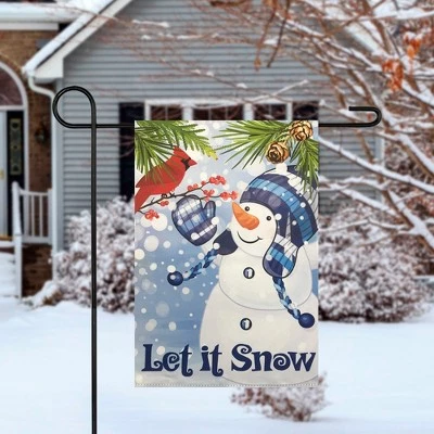 Display your love of the holiday season with this adorable snowman flag! Showing the classic symbols of the season, this flag is the perfect addition to your winter decor. Place this outside of your house and everyone will know where the fun festivities are!Features:Let It Snow outdoor garden flagSmiling snowman in a blue knit winter and mittensCardinal sitting in a red berry holly tree4 yellow birds wearing Santa hatsFalling snowflakes”Let It Snow” written across the bottom of the flagFeatures a soft, high-quality fabric for durabilitySleeve on top allows the flag to slide onto the flagpoleDesign is on both sidesCare instructions: Hand wash in cold water with mild soap. Hang dry. Use cool iron if neededDimensions: 18″ high x 12.5″ wide Material(s): polyesterNote: Flagpole is not included