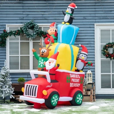 - Show Your Festiveness: You and your neighbors are going to marvel at this inflatable Santa Claus taking friends for a ride in a gift car. This is going to bring your outdoor holiday cheer to new heights and provide days of glad tidings to you.