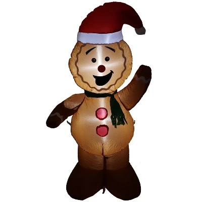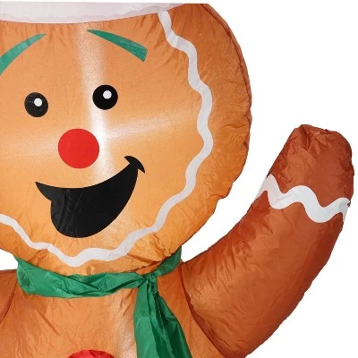 Add a sweet treat to the yard, porch, or patio this holiday season with this inflatable gingerbread man. With 2 built-in LED lights, this gingerbread man is a festive accent for any outdoor or indoor holiday display. This lighted Christmas yard inflatable is made from durable polyurethane-coated 190T polyester and is designed to withstand most mild weather conditions and last through many seasons. The blow-up gingerbread man is easy to use and inflates in approximately 1 minute. This Christmas inflatable decoration comes ready to inflate with a pre-installed blower fan, UL adaptor plug, 2 built-in LED lights, 4 stakes, and 2 ropes. Use the stakes and ropes to tether the lightweight blow-up decoration in place on the ground outdoors. To inflate, simply plug the UL adaptor cord into a standard electrical outlet and watch as the built-in fan blows air into the material. The lights automatically turn on when the inflatable is plugged into a power source.