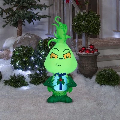 Grow your heart three sizes with an adorable Airblown® Inflatable Little Grinch. Holding a gift, our Little Grinch inflatable makes an eye-catching addition to your Christmas decorations. Setup is super simple. Just plug it in, stake it down and watch the magic unfold. Display this Grinch outdoor inflatable as a standalone or combine it with other Airblown Inflatables to create a custom scene. Includes everything needed for easy setup.